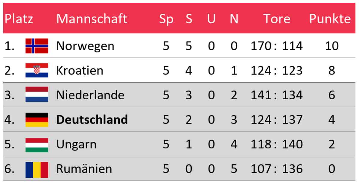 In der Vorrunde konnte sich die deutsche Mannschaft in Gruppe D als Zweiter für die Hauptrunde qualifizieren. Bei den kommenden drei Spielen innerhalb von vier Tagen gegen Ungarn, Niederlande und Kroatien, muss sich das Team um Bundestrainer Henk Groener spielerisch ins Zeug legen um einen der zwei Halbfinalplätze in der Gruppe zu sichern.