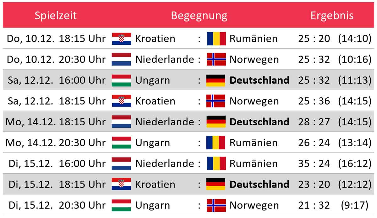 In der Vorrunde konnte sich die deutsche Mannschaft in Gruppe D als Zweiter für die Hauptrunde qualifizieren. Bei den kommenden drei Spielen innerhalb von vier Tagen gegen Ungarn, Niederlande und Kroatien, muss sich das Team um Bundestrainer Henk Groener spielerisch ins Zeug legen um einen der zwei Halbfinalplätze in der Gruppe zu sichern.